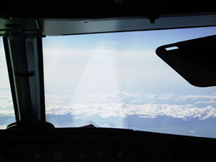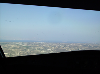 Aus dem Cockpitfenster sind nun die vielen kleinen Inseln um Kos herum gut erkennbar, da wir uns bereits im Sinkflug befinden und uns dem Boden immer mehr nähern.